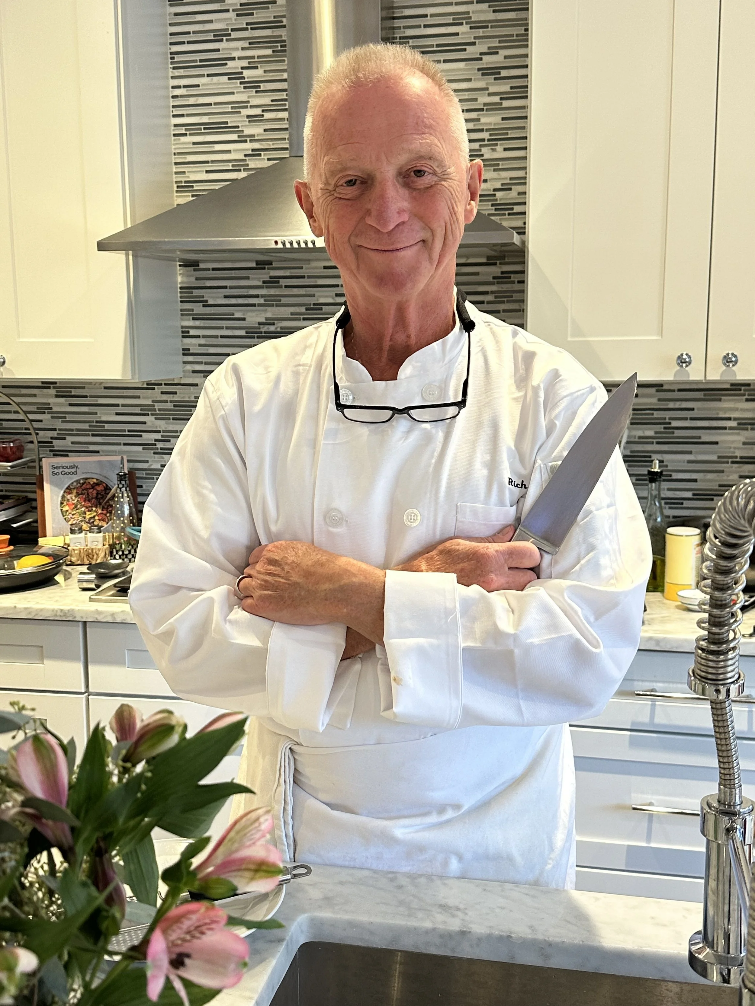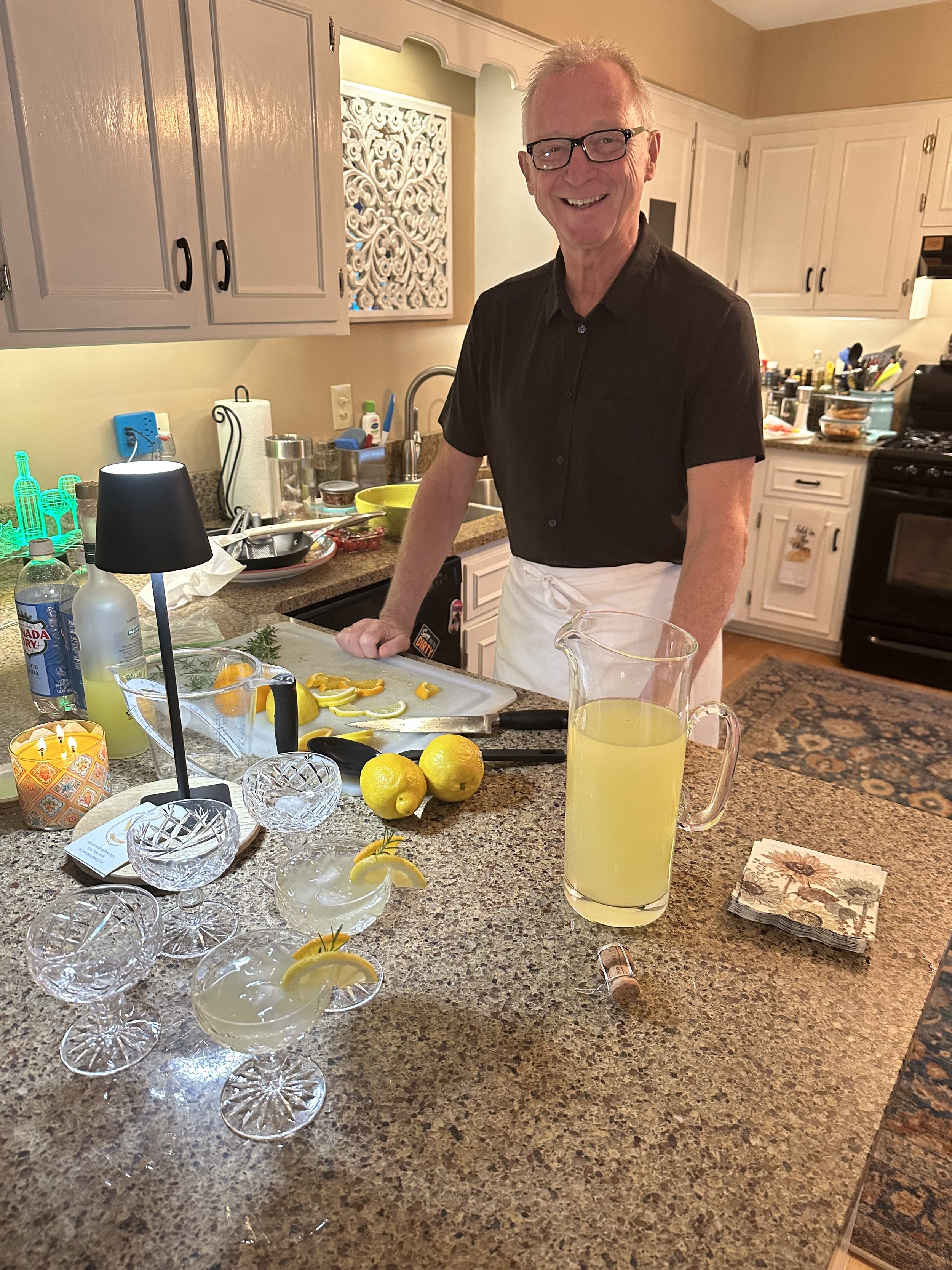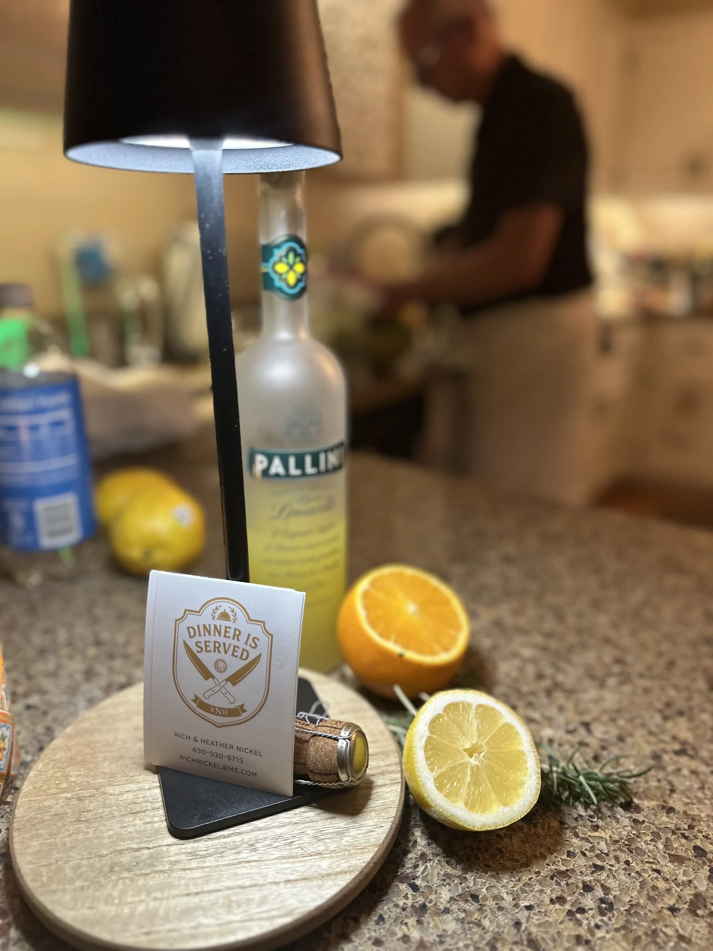 Rich creates the menus, does the shopping, cooking and plating. Heather serves the cocktails, wine and each course. We both do cleanup while having a glass of wine.